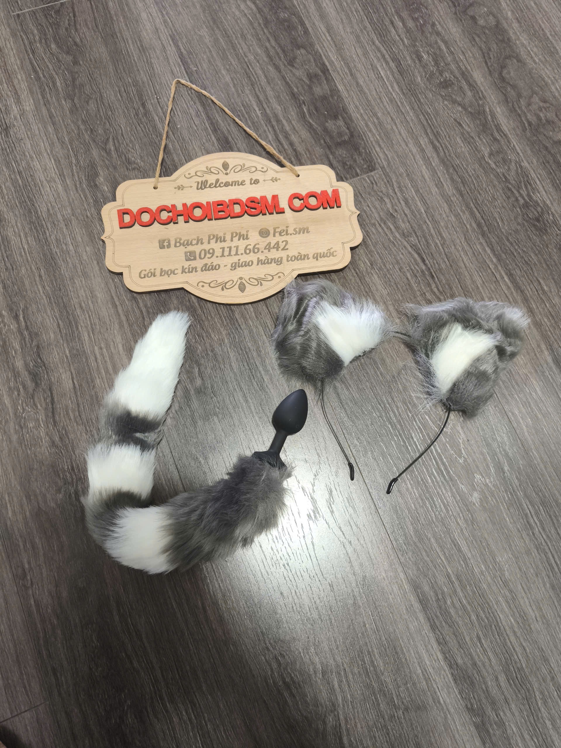Đuôi cáo 40cm silicone kèm tai xám trắng