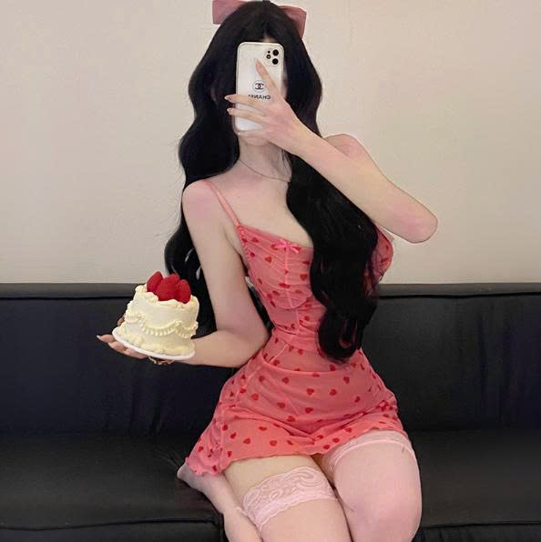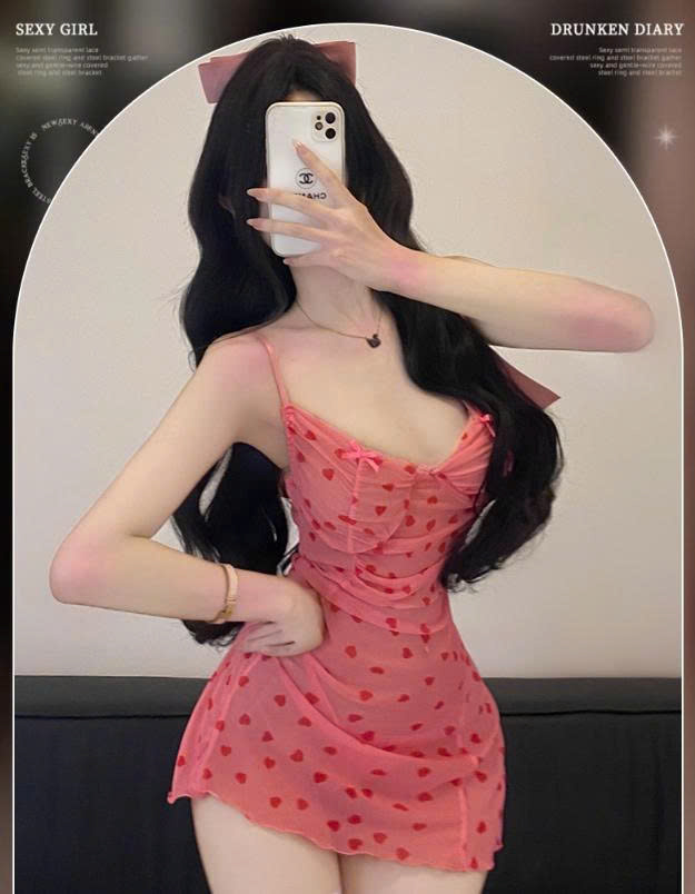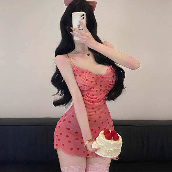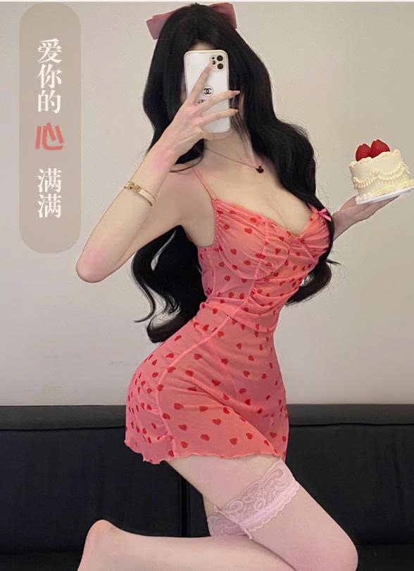 Váy ngủ ren mỏng họa tiết trái tim đỏ